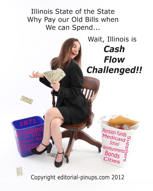 So first the State of Illinois does a 67% increase in state income tax to supposedly pay their bills. Then they don't pay their bills. Underfunded pension funds, stiffing school districts and municipalities. Welching on medicare reimbursements to doctors, pharmacies, day care centers, preschools, suppliers,... you name it. Then Governor Quinn (who was much more fun as a LT. Governor where he couldn't hurt things) wants spend money that the state does not have for the old commitments on new commitments. They do not let me do this to them let alone I should let them do it to me!